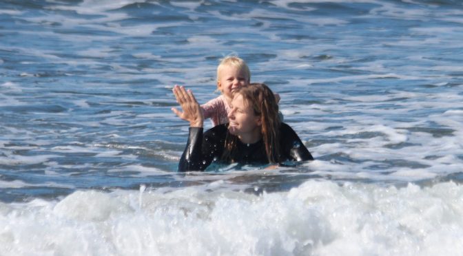 Luckily my son is a very mellow baby who is happy to chill out on the beach while mama goes surfing. My daughter is 2 and loves the ocean and has started asking to catch waves with me. Here’s a snapshot of our surfing life from the past week.